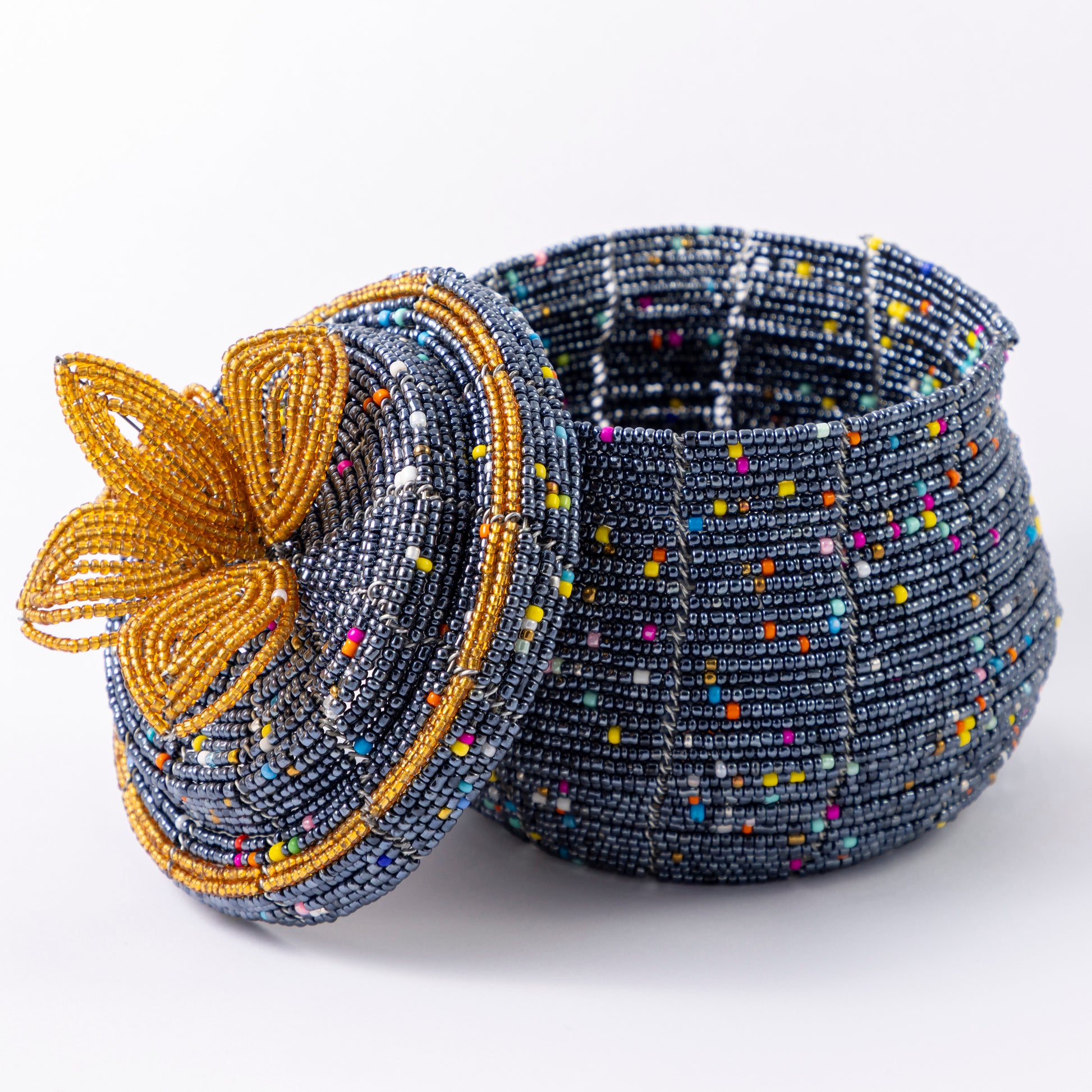 These stunning Maasai jewellery boxes are beautifully made by local craftsmen using tiny metallic beads threaded onto wire. These pretty storage pots are perfect for women and girls to keep jewellery and accessories. They are totally individual and the design incudes a splattering of multicoloured beads and a petal flower on the lid.